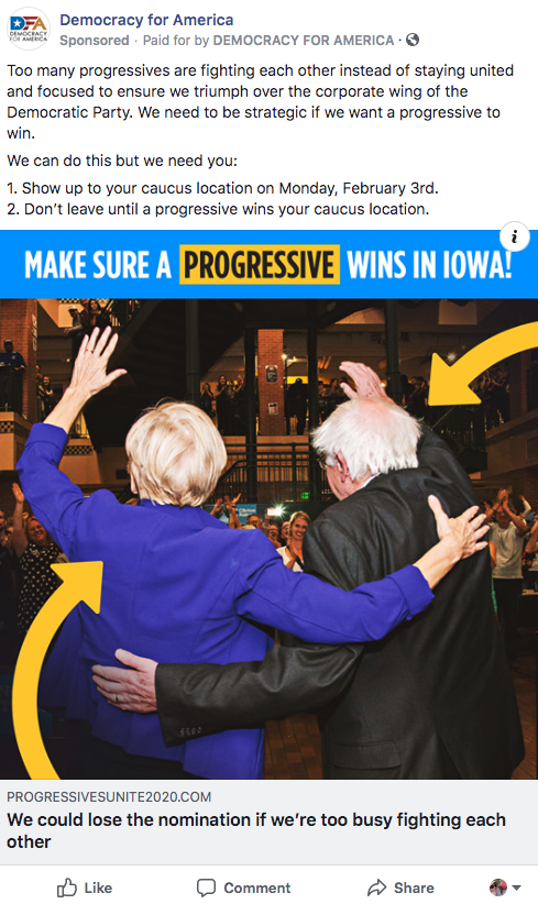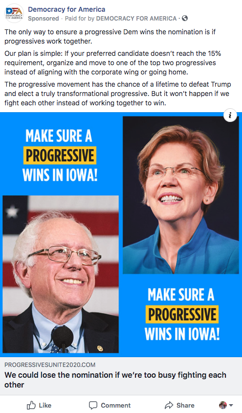 Initial phase features digital media buys to ensure Senator Warren and Senator Sanders supporters work together to win the Iowa Caucus.